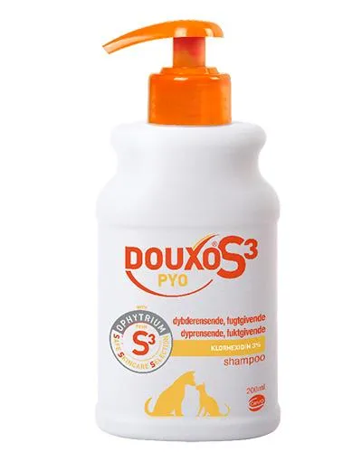 Beskrivelse DouxoS3 Pyo Shampoo er en hunde- og kattesjampo med 3 % klorheksidin, beregnet til uren hud hos hund og katt. Sjampoen har god effekt på uren hud der den renser i dybden, har antibakteriell virkning og bidrar til å motvirke soppinfeksjon. Hudbarrierens økosystem styrkes og balanseres. Med pantenol som bedrer pelskvaliteten, og pentavitin som virker fuktighetsgivende og mykgjørende på både pels og hud. Katte- og hundesjampoen hjelper til å løse opp floker og etterlater pelsen myk og skinnende. Sjampoen har en balansert pH-verdi (5,4–5,6) som fremmer en rik og mangfoldig mikrobiota. Med hypoallergen duft av kokos og vanilje. Pumpeflasken har en ergonomisk form med en gjennomsiktig rand som gjør det lett å se hvor mye som er igjen. DouxoS3 Pyo Shampoo kan brukes alene eller i kombinasjon med DouxoS3 Pyo Mousse. I kombinasjon med mousse anbefales følgende behandling: sjampo på dag 1, mousse på dag 3 og 6 den første uken. Fortsett med mousse tre ganger i uken i ytterligere to uker. Følg alltid veterinærens anbefaling. DouxoS3 er en serie med trygge og effektive produkter innen hud- og pelspleie til hund og katt, utviklet i samarbeid med veterinærer og dyreeiere. Serien inneholder hundesjampo, kattesjampo og andre pelspleieprodukter tilpasset ulike hudtilstander og behov. Alle produktene inneholder Ophytrium som bidrar til å styrke hudbarrieren, dempe hudirritasjon og balansere hudens følsomme økosystem. Douxo S3 stiller høye krav til kvalitet, og produktene er kvalitets- og toleransetestet på både dyr og mennesker. |